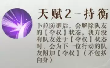 天赋“持衡”是维持【夺权】循环持续运转的核心。每当庞羲执行下拉防御操作后,当前持有【夺权】的队友状态会被移除,但紧接着,下一个即将行动的队友会立即重新获得【夺权】。这使得状态像接力棒一样在队伍中传递,只要庞羲保持合理的行动节奏,队伍中几乎总有人处于【夺权】加持之下,从而确保技能收益的连贯性与稳定性。
