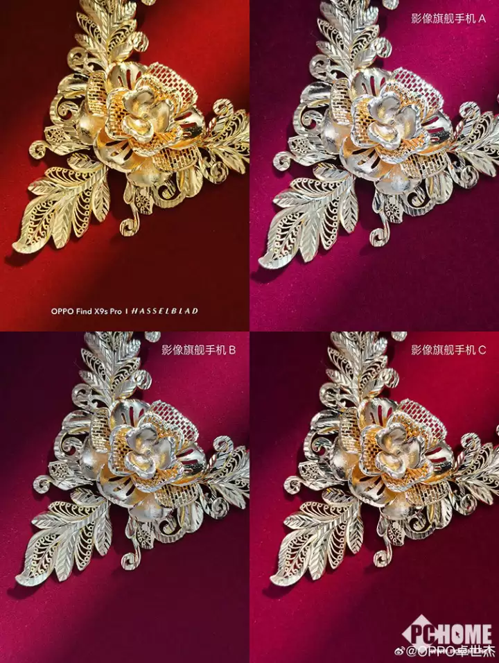 与此同时,第二代技术还集成了全新的DCG-HDR(双转换增益高动态范围)技术,一举将动态范围提升至惊人的15EV。这代表着在极限大光比场景下,无论是高光部分的云层纹理,还是阴影深处的细节层次,都能被完美地捕捉与保留。官方样张对比清晰地展示了这一优势:在充满红色环境光的橱窗前拍摄金色饰品,Find X9s Pro能同时精准还原饰品璀璨的金色与背景浓郁的红色,而不少竞品则会出现金色黯淡或红色溢出的问题。这一细节差异,正是色彩科技实现跨越的直观证明。