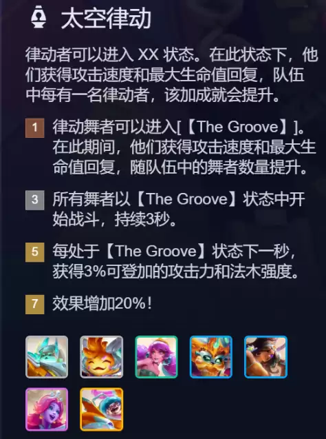 激活太空律动羁绊后,所有律动者棋子将进入独特的【The Groove】节奏状态。在此状态下,棋子不仅能获得攻击速度加成,还能持续回复生命值。最关键的是,这些增益效果会随着你场上“太空律动”棋子数量的增加而线性提升,是一个典型的滚雪球式团队羁绊。