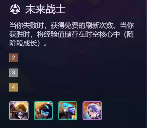 “未来战士”羁绊的核心优势在于,它能将每一场对局的胜负结果都转化为有效的运营资源。当对局失利时,你会获得免费的商店刷新次数,帮助你在经济劣势时更快地搜到关键英雄,实现逆风翻盘;当对局获胜时,原本获得的部分经验值会被储存于“时空核心”之中,这些储存的经验值可以在后期关键时刻用于快速提升人口,且储存效率随游戏阶段提升而显著增强。