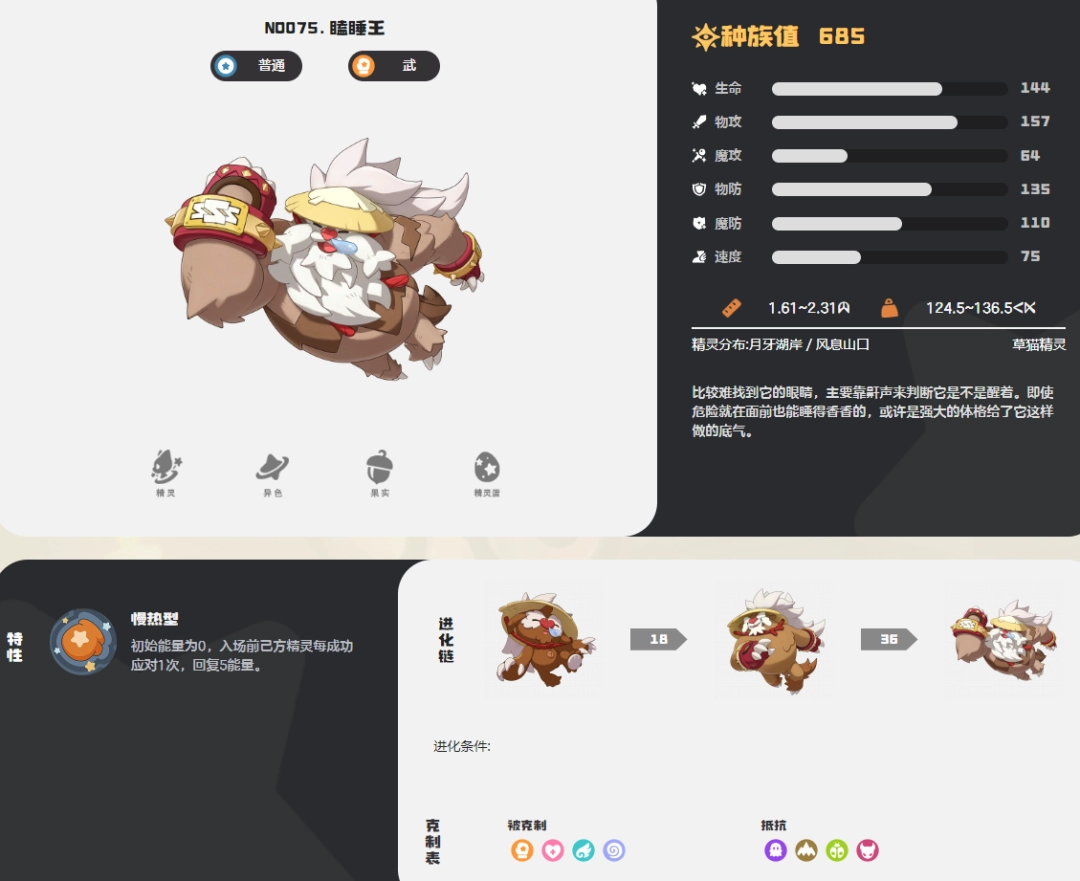 想要辨认洛克王国中的瞌睡王,找到它的眼睛可是一项挑战。这只以嗜睡闻名的宠物,最显著的特征莫过于它那标志性的、连绵不绝的鼾声。玩家往往需要通过这独特的声响,来判断它究竟是处于沉睡状态,还是勉强维持着“清醒”。令人称奇的是,即便面对逼近的危险,瞌睡王也常常能泰然处之,继续它的美梦,这份处变不惊的淡定着实让许多训练师印象深刻。当然,这份底气很大程度上来源于它强健的体魄与厚实的生命值,仿佛在无声地宣告:“任何挑战,都等我睡醒再来。” 本文将为你全面介绍瞌睡王的种族值、技能搭配、获取方式以及进化路线,帮助你在游戏中更好地培养与运用这只特别的宠物。