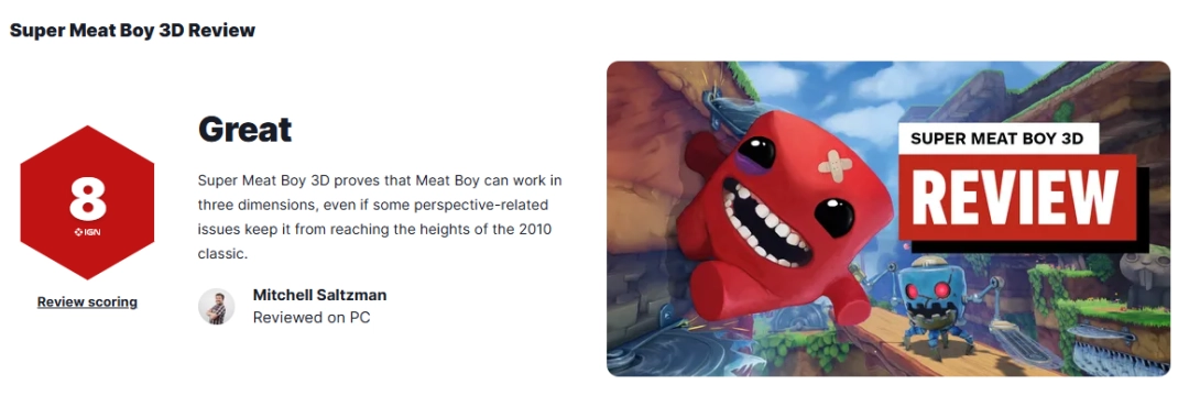 那么,这次从2D到3D的平台跳跃维度升级究竟成功吗?全球知名游戏媒体IGN为本作给出了8分的优良评价,认为《超级食肉男孩3D》实实在在地证明了肉肉男孩在复杂的三维空间里同样能游刃有余、大放异彩。评测文章特别指出,游戏精准捕捉并继承了原作的核心精髓与灵魂,其操控手感出色地还原了系列独有的、高速且精确的机动特性。当玩家完全进入状态,行云流水般飞掠穿梭于各个立体关卡,在密集的旋转锯片、尖刺陷阱间完成一次次优雅的闪转腾挪,并最终斩获A+评级时,所获得的巅峰操作体验与成就满足感绝对是无可替代的。