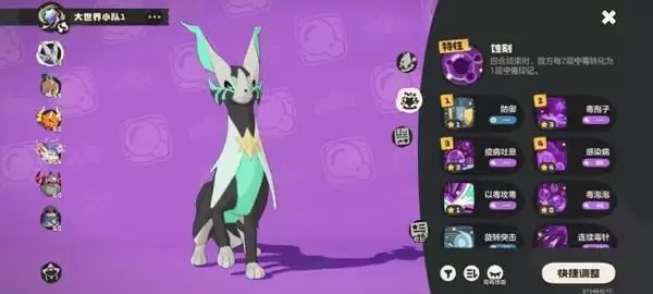 月亮鱼的被动技能是续航的关键:当对手因中毒状态损失生命值时,月亮鱼会为自己回复一定生命值,保证了队伍的持久作战能力。而裘卡的被动则是整个战术的引擎:它能将对手身上的每两层毒素效果,转化为一层持续时间更长的“毒素印记”。该印记的特殊之处在于,即使对手更换上场精灵,印记效果依然存在,除非对方使用特定的净化类技能。