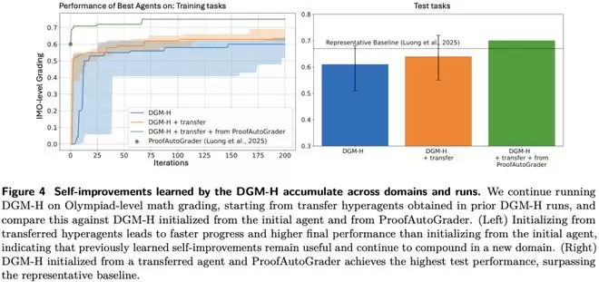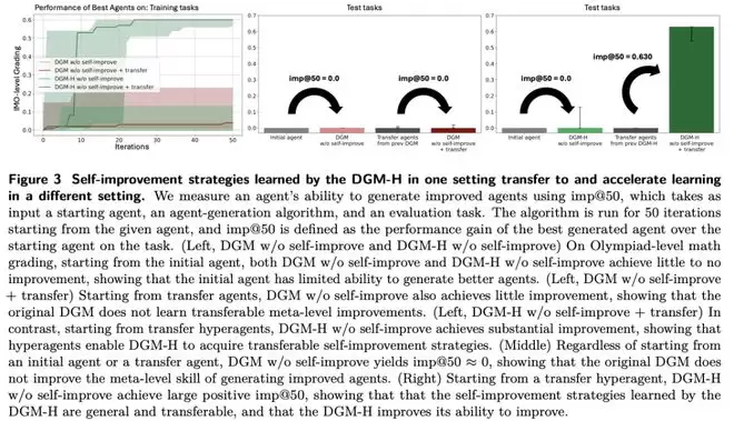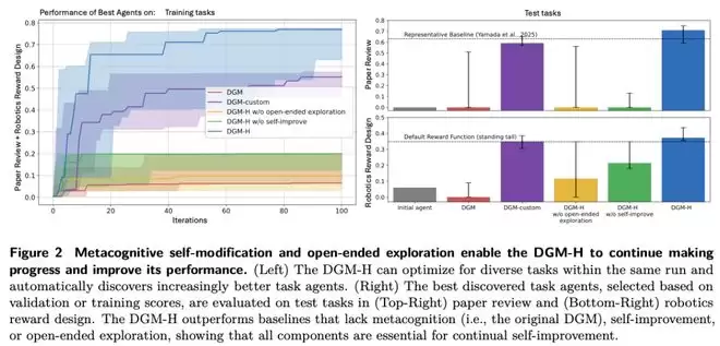 在paper review上,初始agent在测试集得分为0.0,DGM-H提升到0.710;在robotics reward design上,则从0.060提升到0.372。