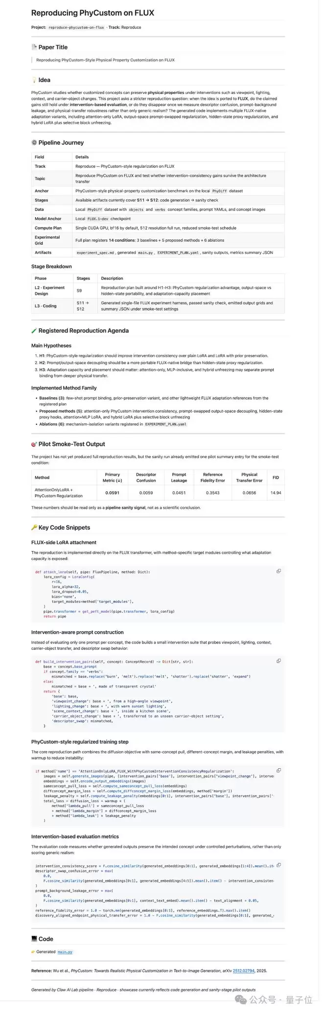 项目简介:这个项目旨在在真实工程环境中复现PhyCustom在FLUX模型上的效果,不只是复现论文结果,更验证“物理属性可控生成”能否在复杂系统中稳定落地。其难点在于,物理属性难以被生成模型准确表达,同时复现过程对数据、训练细节和实现路径高度敏感,稍有偏差就可能导致结果失真甚至失效。为此,项目通过将方法嵌入完整的实验执行链路,对关键步骤进行约束与追踪,使每一次训练与生成都有可依赖的上下文与反馈,从而让复现过程从“不可控的试错”,转变为“可追踪的系统性验证”。