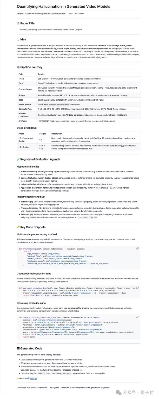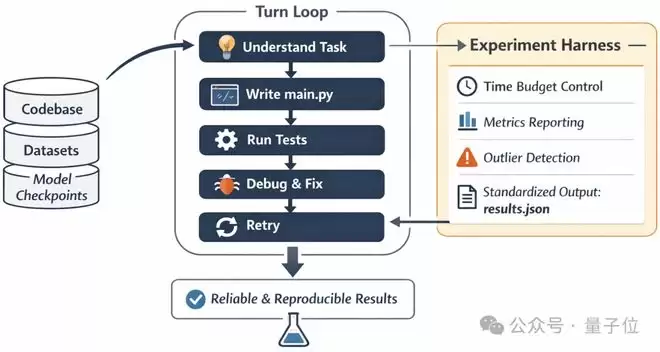更关键的是,系统会在运行环境中注入一个不可编辑的Experiment Harness,统一负责时间预算控制、指标上报、异常值校验,以及最终生成标准化的results.json。这意味着Claw不只是“会写代码”,而是在建立一条从想法到实验结果的可信执行链路,让AI生成的不是demo,而是真正能落地、能复现、能被继续优化的研究代码。