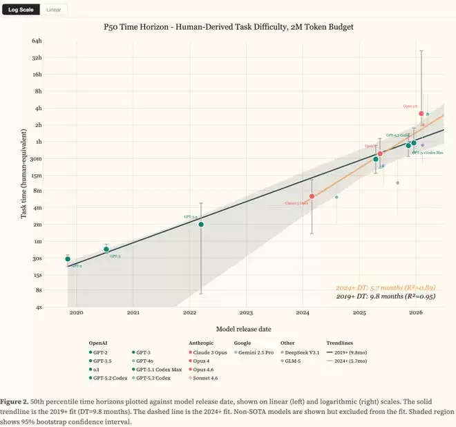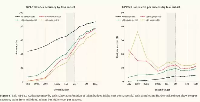 GPT-5.3 Codex和Opus 4.6,在2M token预算下就50%成功率干掉人类专家3小时任务。