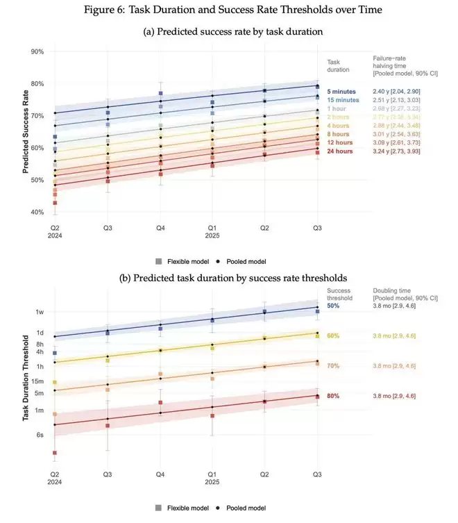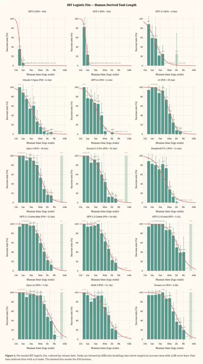Lyptus把每个任务先标上「一个熟练人类专家通常要花多久完成」,再看模型在不同难度上的成功率;