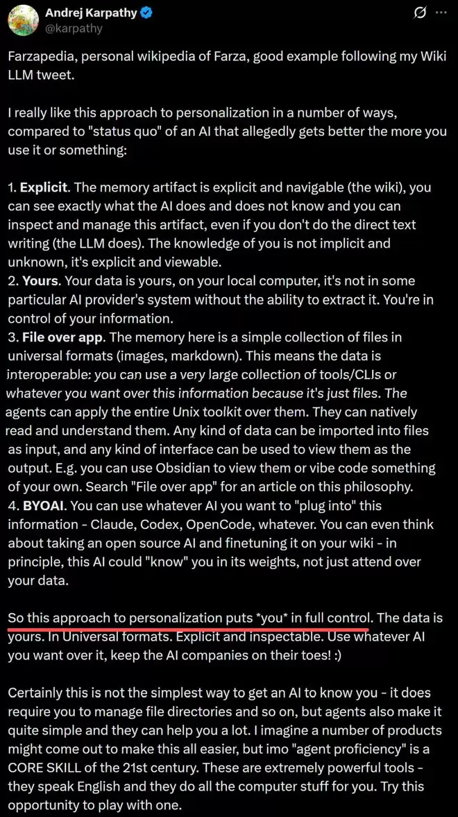 卡帕西的总结很干脆:这种个性化方案把你放在了完全的控制位上。数据是你的,格式是通用的,内容是透明的。用哪个AI随你挑,让AI公司们保持紧张吧!