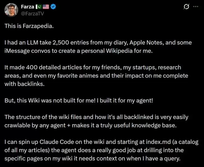 开发者Farza紧随其后,直接用这套思路,把自己2500条日记、笔记和iMessage消息,让大模型「编译」成了一个拥有400篇结构化文章的个人Wiki百科——Farzapedia。