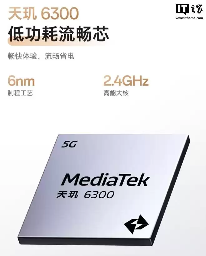 新机搭载 MediaTek 天玑 6300 移动平台(最高主频 2.4GHz),采用 LPDDR4X+UFS 2.2 组合,后置 5000 万像素广角摄像头 + 200 万像素黑白摄像头,前置 800 万像素摄像头。