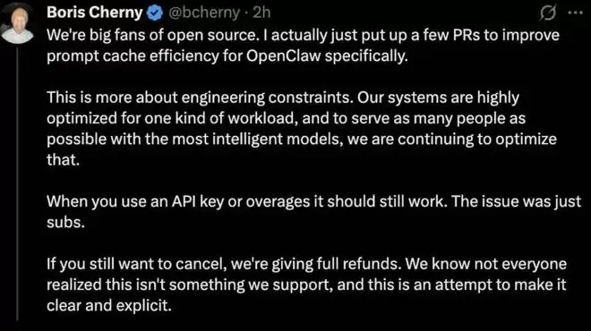对此,Claude Code 负责人 Boris Cherny 公开回应,「我们非常支持开源精神。实际上,我就刚刚提交了几个 PR,专门用于提升 OpenClaw 的提示缓存效率。这次政策调整更多是出于工程层面的限制考量。我们的系统针对特定类型的工作负载进行了高度优化,为了能够以最智能的模型服务尽可能多的用户,我们将持续推进这方面的优化工作。当您使用 API 密钥或超额用量时,第三方工具仍可正常使用。此次问题仅涉及订阅额度的使用方式。如果您仍希望取消订阅,我们提供全额退款。我们理解并非所有用户都清楚这一直以来并非我们最新支持的使用方式,此次政策调整正是为了让相关规定更加清晰明确。」