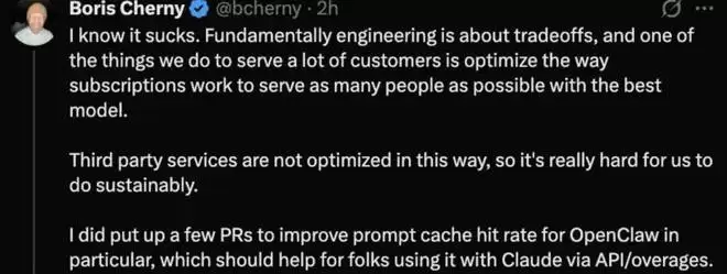 面对这样的批评,Boris Cherny 承认:「我知道这很糟糕。」但他也解释了背后的无奈:工程上本质就是权衡取舍。订阅模式若要服务尽可能多的用户,就必须对资源消耗方式进行精细管控,而第三方工具,如 OpenClaw 没有做这种优化,导致消耗非常不高效,长期难以为继。