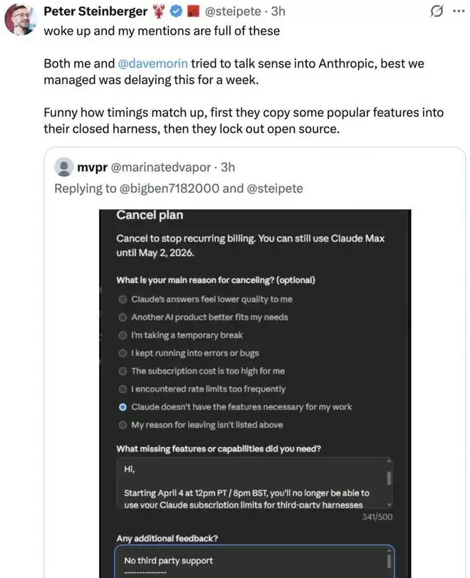 「我和 @davemorin 之前都试图跟 Anthropic 沟通,最终也只帮大家争取到了一周的延迟。讽刺的是时机太巧了,他们先把社区里受欢迎的功能抄进自己封闭的系统(closed harness)里,然后又将开源工具拒之门外。」