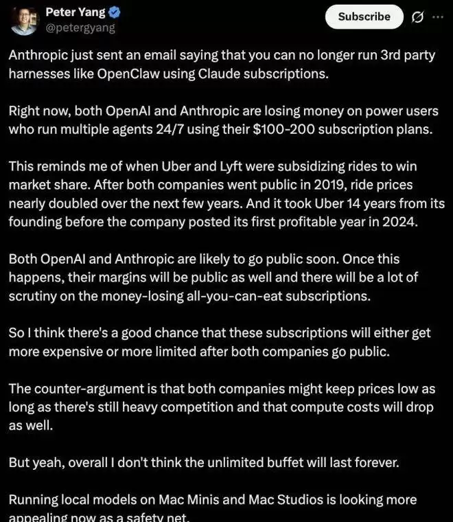 如今,OpenAI 和 Anthropic 也很可能步入上市倒计时。一旦上市,利润率将公开透明,「亏本的无限量订阅」模式势必受到投资者和市场的严格审视。届时,订阅价格上涨或使用限制收紧的可能性相当大。