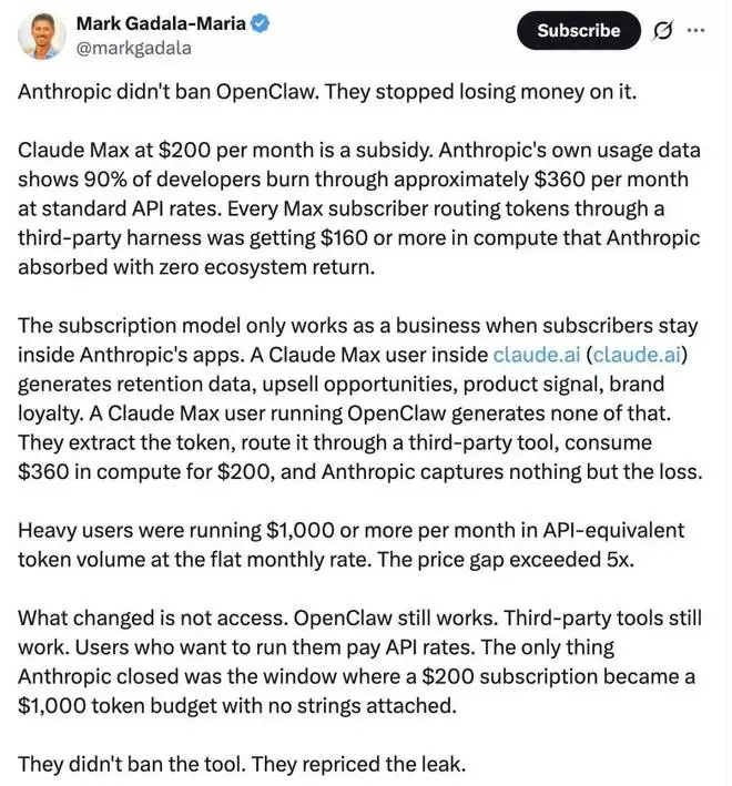 因为订阅模式只有在用户停留在 Anthropic 自家应用内时,才成立为一个健康的商业模式。比如,一个在 Claude 游戏内使用 Claude Max 的用户,会产生留存数据、带来增购机会、提供产品反馈信号,并强化品牌黏性。可一个通过 OpenClaw 使用的用户,则完全不会产生这些价值。他们只是提取 token,通过第三方工具调用,花 200 美元消耗掉价值 360 美元的算力,Anthropic 得到的可不只有亏损?