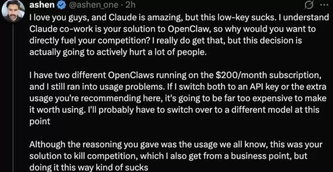 他直言理解 Anthropic 想推动自己的 Claude Code 来取代 OpenClaw,不想继续「补贴」竞争对手,但这个做法会伤害很多重度用户。他自己有两个 OpenClaw 实例跑在 200 美元 / 月的订阅上,本来就经常碰到用量限制。如果现在改用 API key 或者额外付费包,成本会高到不划算,他很可能要转用其他模型了。