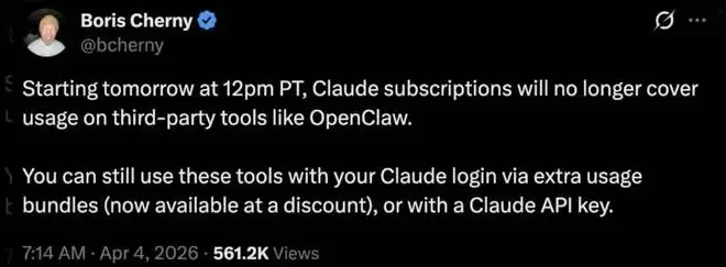 此政策将于 4 月 4 日起首先在 OpenClaw 上执行,但适用于所有第三方工具,并将陆续推广至更多平台。