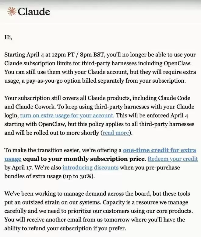刚刚,不少 OpenClaw 用户收到一封来自 Anthropic 的邮件。邮件宣布,从太平洋时间 4 月 4 日中午 12 点起,Claude 订阅将不再涵盖 OpenClaw 等第三方工具的使用。