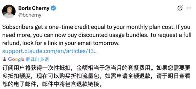 不过,Anthropic也提出了补偿措施,订阅用户将获得一次性等额月费积分。如果需要更多抵扣额度,现在可以购买折扣使用包。如果想要全额退款,明天的邮件就会包含申请全额退款的链接。