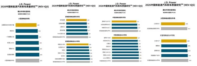 共有来自14个细分市场的14款车型在2026年中国新能源汽车新车质量研究(NEV-IQS)中摘得奖项。纯电动MPV细分市场因为不满足细分市场获奖条件,因而没有奖项颁出。获得所在细分市场奖项的车型有: