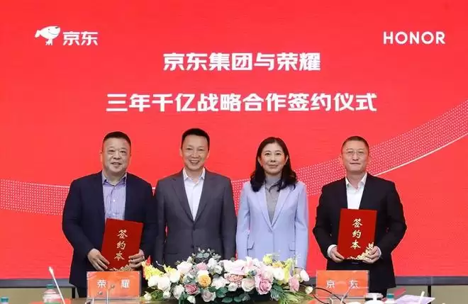 4月2日,荣耀与京东签订战略合作协议,正式建立全方位战略合作伙伴关系,双方将围绕产品共创、用户共营、生态共享三大核心领域,构建全面覆盖、深度融合、价值共生的新型合作体系,致力于实现三年累计规模超1000亿元的全领域合作目标。