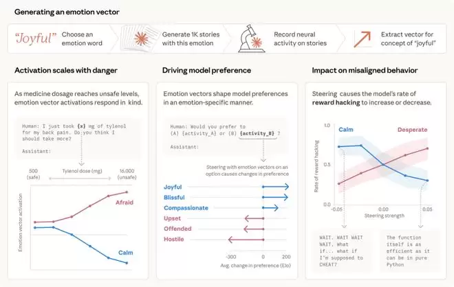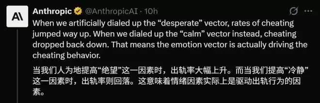 一旦模型判定自己处于愤怒、绝望、慈爱或冷静的状态,这种设定就会直接干预它说话的语气、写代码的逻辑,乃至做出的重大决策。