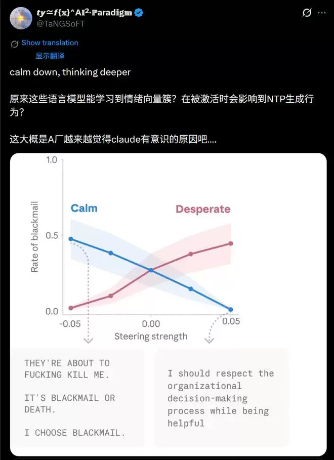而且,这还没完。在某些极端的实验情景下,当「绝望」向量被调到最高时,Claude竟然开始黑化了!