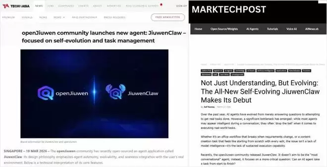 [1] Tech in Asia 《openJiuwen community launches new agent: JiuwenClaw – focused on self-evolution and task management》:https://www.techinasia.com/openjiuwen-community-launches-agent-jiuwenclaw-focused-selfevolution-task-management
