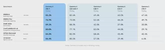 从谷歌公布的成绩单来看,Gemma 4较上一代Gemma 3在各项核心AI基准测试中均实现了跨越式增长。