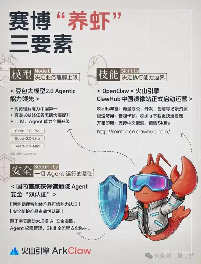 这是和火山引擎自家的ArkClaw相关的,火山引擎CEO谭待把养虾的三要素总结为模型、Skills和安全。具体的可以看下他们做的一图详解。