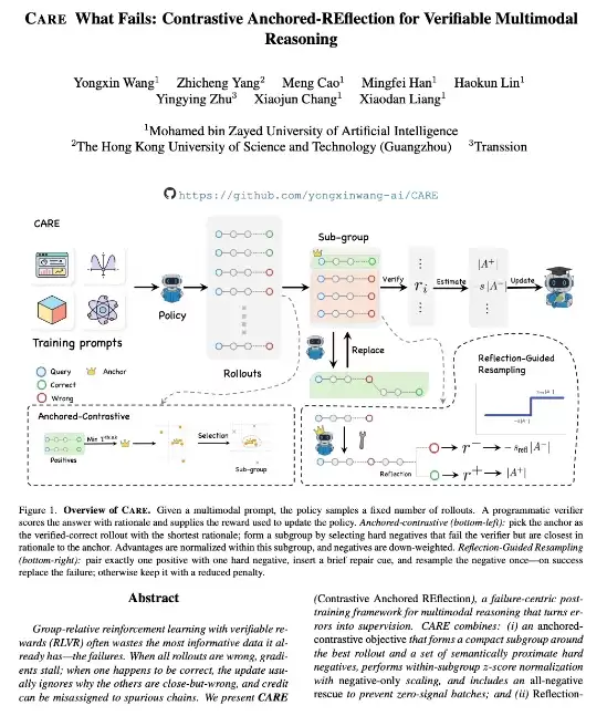 针对这一问题,传音TEX AI中心与中山大学、MBZUAI团队合作,开发了CARE(Contrastive Anchored REflection)技术,从训练机制上对传统路径进行了优化。不同于仅以“结果对错”作为反馈信号的方式,CARE技术将关注点前移到推理过程本身,重点引入“高质量错误样本”——即那些接近正确但存在关键步骤偏差的解题路径。通过将这类样本与标准解法进行对比分析,并结合反思式重推理机制,模型能够识别具体错误环节,并完成自我修正,从而形成更稳定、连贯的推理能力。在引入反思机制后,模型对复杂问题的二次推理成功率由约10%–19%提升至76.6%,有效增强了面对复杂题目时的稳定性。