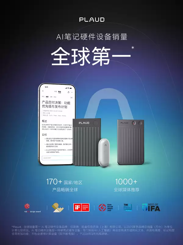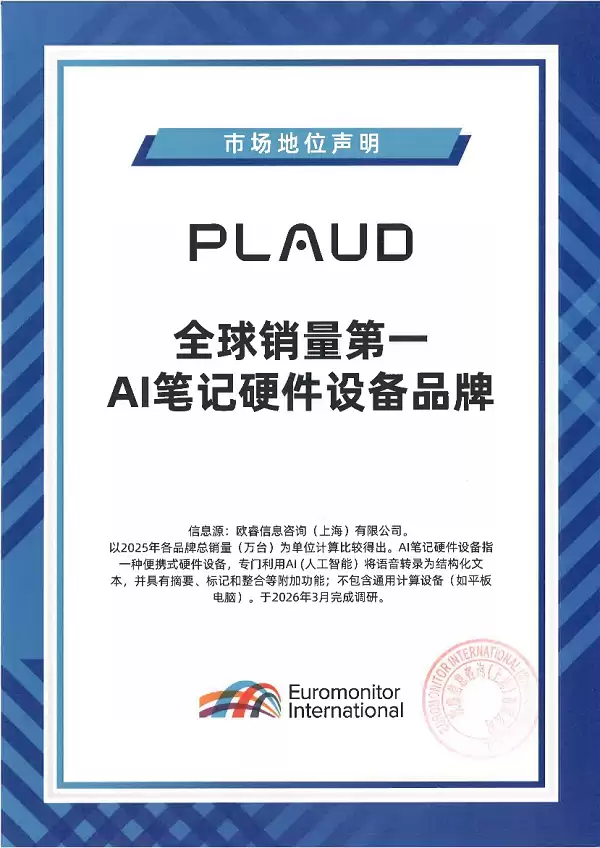 自2024年产品上市以来,Plaud深耕AI纪要领域,以软硬一体、深度运用大模型能力的创新解决方案快速占领全球市场,登顶全球AI笔记硬件销量榜首。凭借领先的产品设计、流畅的用户体验与强大的AI能力,目前Plaud在全球已拥有超150万专业用户,产品覆盖170个国家(地区),在北美、欧洲、亚太等核心市场持续领跑。此次获欧睿 “AI笔记硬件设备销量全球第一品牌” 认证,亦是Plaud全球化发展的又一个重要里程碑。