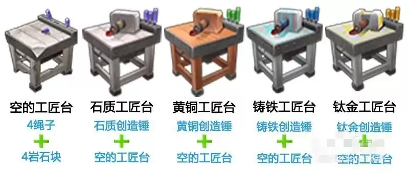 将制作完成的钛金创造锤和空的工匠台进行合成,即可获得钛金工作台。