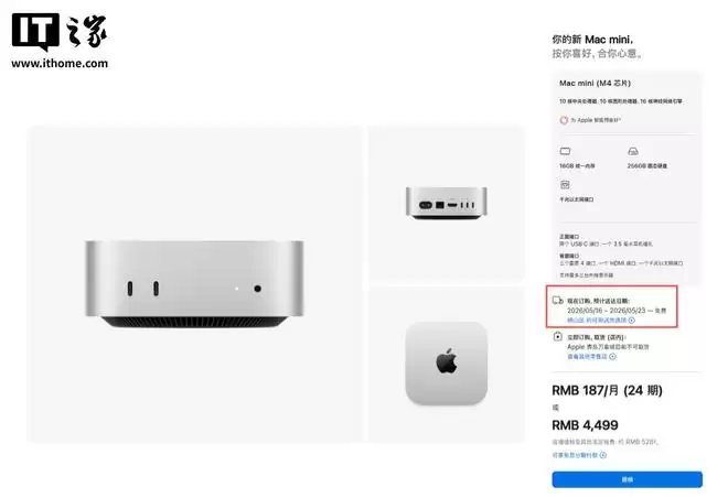 IT之家注意到,即便售价 4499 元、搭载 M4 芯片与 16GB 内存的基础款机型,也存在一个月的发货延迟。