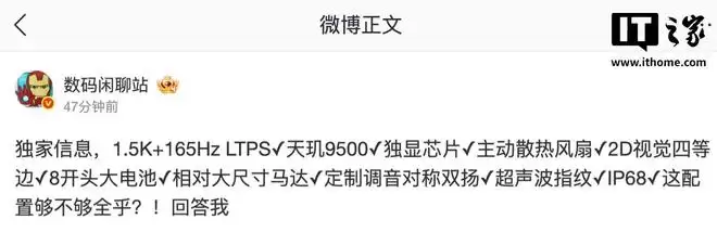 博主 @数码闲聊站 此前爆料称,某厂天玑 9500 新机将搭载 1.5K 165Hz LTPS 屏幕,具备独显芯片、主动散热风扇,屏幕采用 2D 视觉四等边设计,具备 8 开头大电池、相对大尺寸马达、定制调音对称双扬声器以及超声波指纹,还有 IP68 防尘防水。