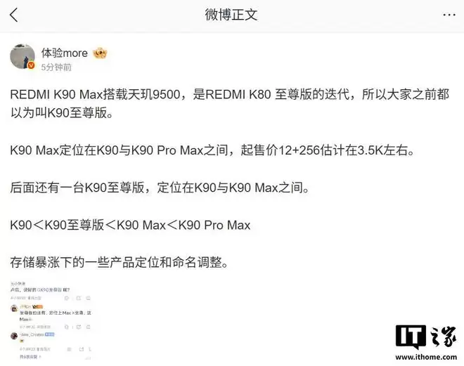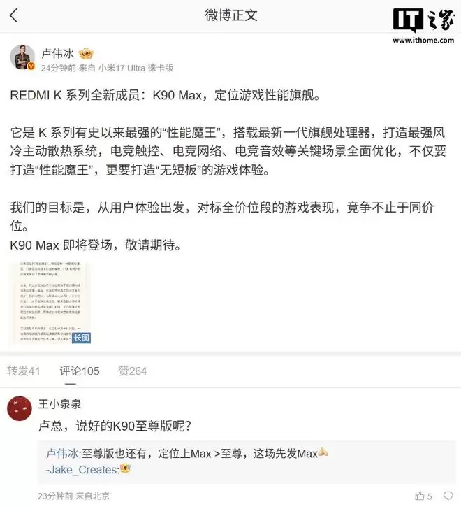 IT之家注意到,卢伟冰还在微博中透露,REDMI K90 至尊版也还有,定位上 Max > 至尊,这场先发 Max。