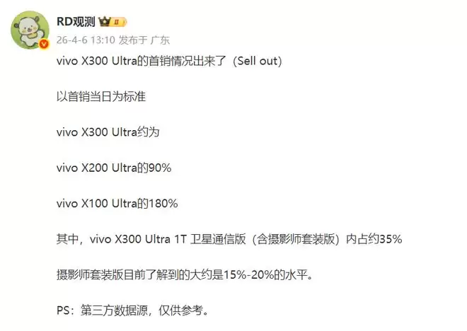 vivo X300 Ultra首销当天的销量约为vivo X200 Ultra的90%,为vivo X100 Ultra的180%。换言之vivo X300 Ultra首销当天是不如vivo X200 Ultra,但远超vivo X100 Ultra。其中vivo X300 Ultra的1TB版本(包括摄影师套装版)占比约为35%,单独算摄像师套装版占比约是15-20%左右。看似vivo X300 Ultra的首销不如vivo X200 Ultra,但是大家要明白一个现实的环境,今年vivo X300 Ultra的售价涨了很多,虽然首销不如上一代,但在销售额上肯定是远超上一代的,毕竟最高配版本占比在三分之一以上。
