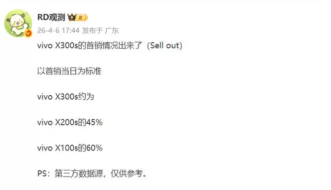 现在来看vivo X300s的首销情况,根据行业人士提供的数据。vivo X300s首销日的销量约为vivo X200s的45%,约为vivo X100s的60%。也就是讲vivo X300s在首销日的销量不仅不如vivo X200s也是不如vivo X100s的。这个成绩显然……其实不如vivo X200s是可以理解的,毕竟最新都表示vivo X200s是近五年来X系列销量最好的单品,去年真的卖爆了。当然了我们也需要考虑大环境的问题,这一次vivo X300s的涨价幅度可不小。等后续进入平销期后,再看看其表现吧!