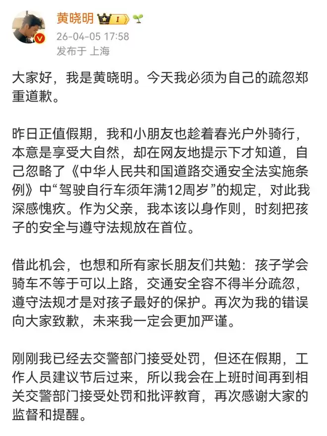 清明节假期,艺人黄晓明首次公开分享与9岁儿子小海绵的春日骑行合照,结果评论区瞬间成普法现场,引发网友热议!