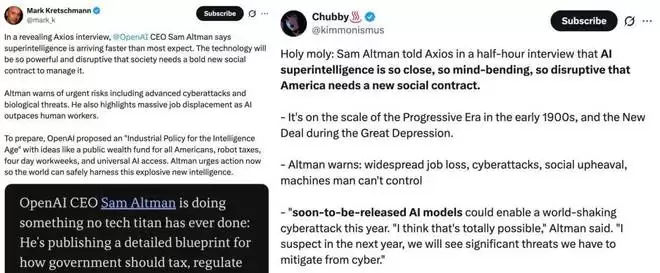 昨晚,在一场引人注目的 Axios 采访中,OpenAI CEO Sam Altman 表示,「超级人工智能的到来比大多数人预期的要快。这项技术将变得如此强大和具有颠覆性,以至于社会需要制定一个大胆的新社会契约来加以管理。」