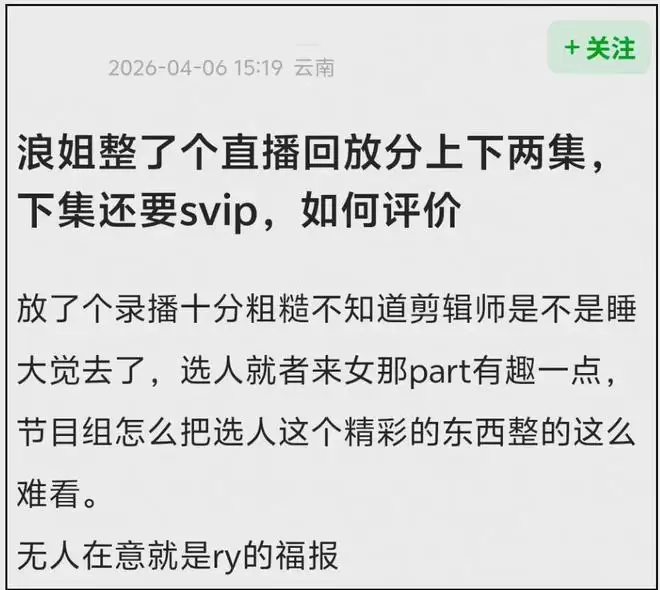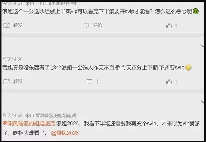 不止一位网友对《浪姐7》更改观看模式表达了不满,吐槽节目组吃相难看。