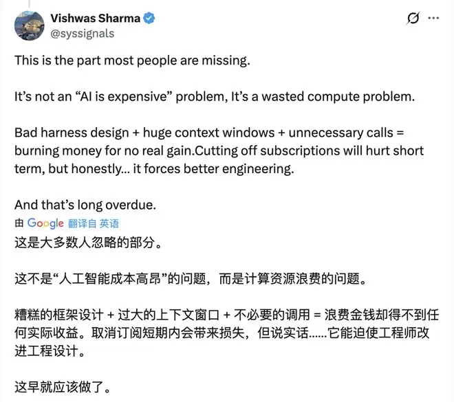 订阅制的问题在于,它让 harness 开发者从来不需要为单次请求的 token 消耗负责。上下文管理差不要紧,cache 命中率低不要紧,反正成本由 Anthropic 的服务器悄悄吸收。