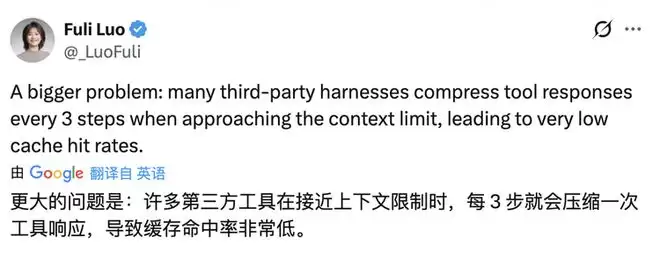 第二个层面是缓存效率。她在评论区补充道:"更大的问题是,很多第三方 harness 在接近上下文长度限制时,每隔几步就压缩一次工具返回结果,导致 cache 命中率极低。"