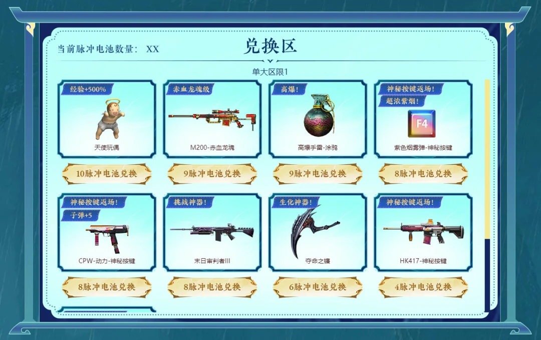 参与方法:这是本次活动的精华部分。“脉冲电池”是你的专属兑换货币。获取方式为:4月4日-5日登录可得2个,其他日期每日登录得1个,每周登录“掌上火线”App可再得1个。积攒电池,即可在兑换池中自由挑选心仪的终极奖励,包括多款热门武器与稀有角色皮肤,所有道具任你挑选。