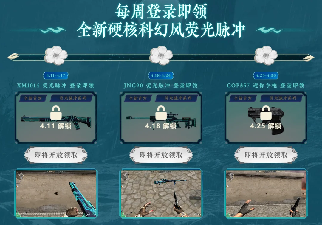核心奖励:XM1014-荧光脉冲(4.11-4.17)、JNG90-荧光脉冲(4.18-4.24)、COP357-迷你手枪(4.25-4.30)