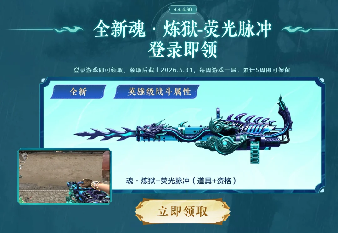 参与方法:在活动期间内登录游戏即可直接领取该武器。请注意,若想将其永久保留,需在5月31日前完成挑战任务:累计五周,每周至少完成一局游戏。这是四月活动的核心福利,CFer们务必不要错过。