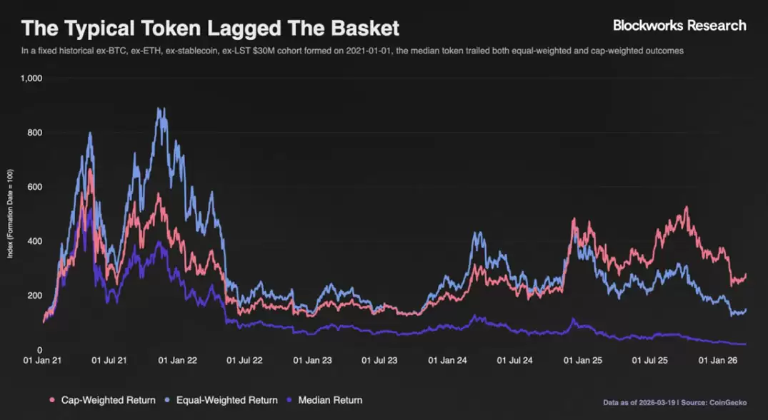 再看中位数回报,下跌更为剧烈。绝大多数代币从历史高点回落了大约80%。这清晰地表明,市场涨幅高度集中在比特币、以太坊等极少数大型资产上,而整个市场的普遍表现其实相当疲软。