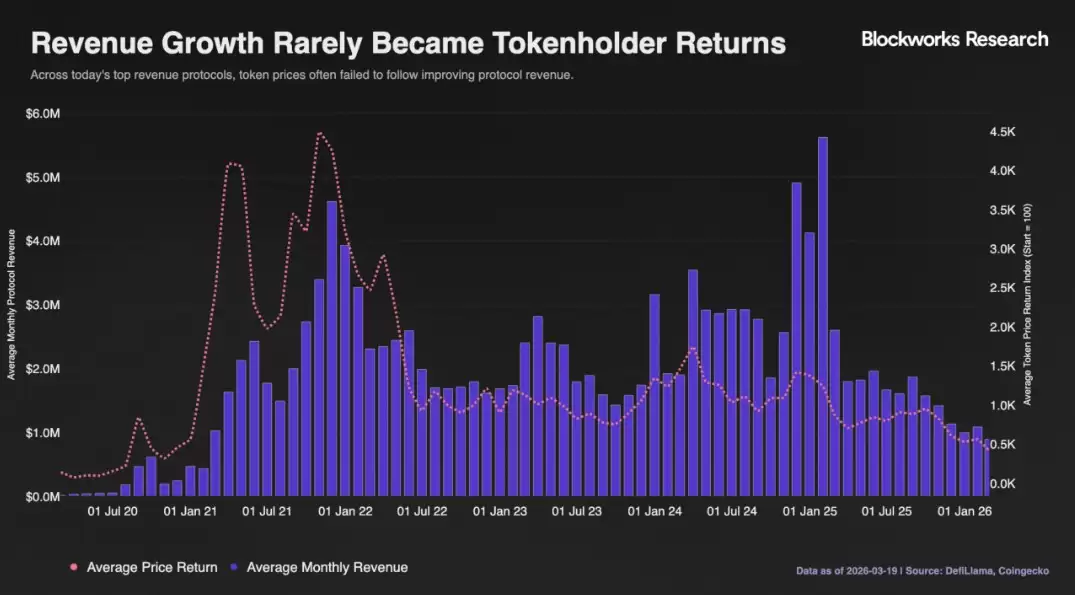 更令人警惕的是,价格与基本面之间的纽带似乎正在松动。回溯到2021年,代币价格还能紧密追踪链上的实际收入。然而最新的数据揭示了一个脱节的现象:尽管许多协议的链上收入已经回升,但其代币价格却迟迟未能跟上。这意味着,生态的使用活跃度与投资者的财务回报之间,出现了明显的断层。