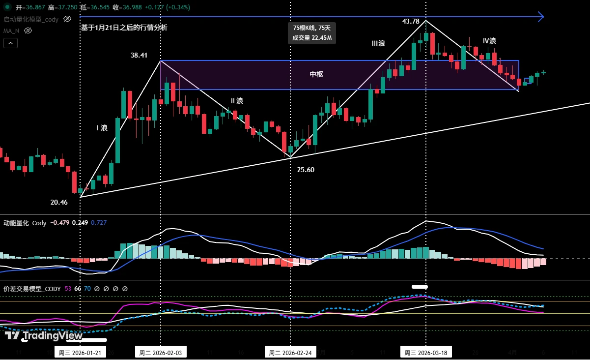 • Ⅳ浪(调整浪):自3月18日触及43.78美元的高点后,价格再次进入调整阶段,即目前正在运行的IV浪。截至分析时,调整已持续18天,期间最大跌幅为21.33%。